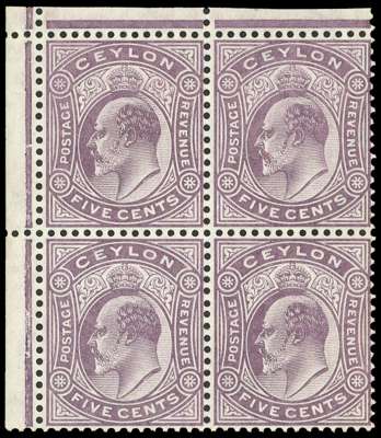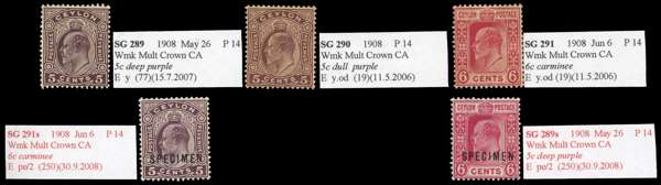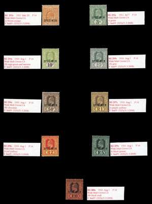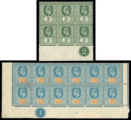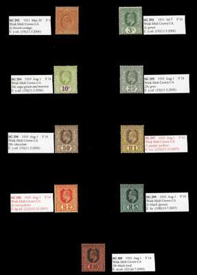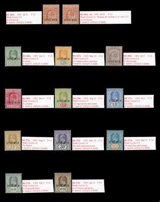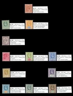 1903-11 KEVII mint collection arranged on Hagners, including 1903-04 trimmed-down die proofs for 2c 5c & 6c values 1903-04 basic set and ‘SPECIMEN’ set, 6c carmine, variety WATERMARK INVERTED 1904 set, with 3c green in plate block of six and 75c dull blue & orange in plate block of 12, 1908 set with ‘SPECIMEN’ 1910-11 set and ‘SPECIMEN’ set, generally fair to fine condition. SG 265-300 £1200+