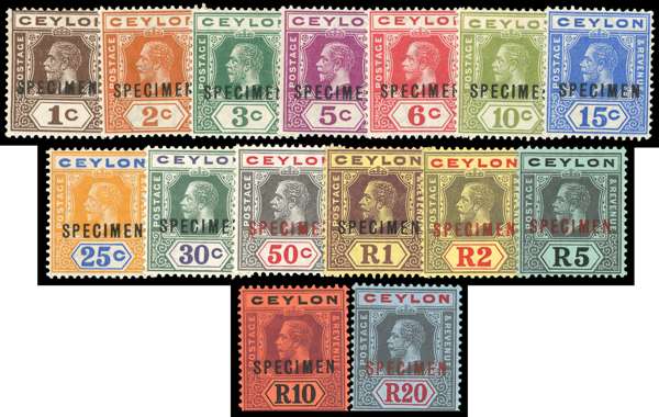 1912-25 Wmk MCA set of fifteen to 20r black & red on blue, optd ‘SPECIMEN’ large part o.g., odd minor imperfections, still of fine appearance. SG 301-319s £425
