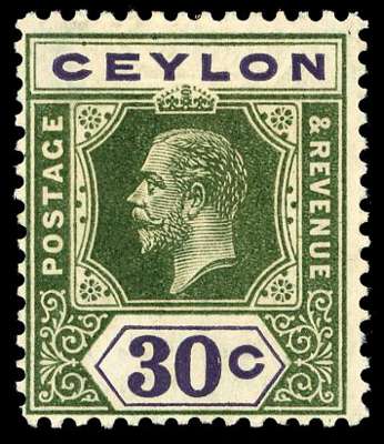 1912-25 Wmk MCA 30c blue-green & violet, variety DUTY PLATE (CEYLON & 30c) PRINTED DOUBLE ONE ALBINO & INVERTED, large part o.g. an interesting and scarce variety. SG 313awa £375