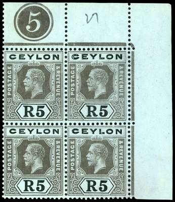 1912-25 Wmk MCA 5r blue on blue-green (olive back), Die I, top right plate marginal block of four with plate number ‘5’, variety WATERMARK INVERTED, unmounted o.g. trivial gum wrinkles, still a fine and handsome rare positional multiple. SG 317bw £400+