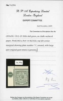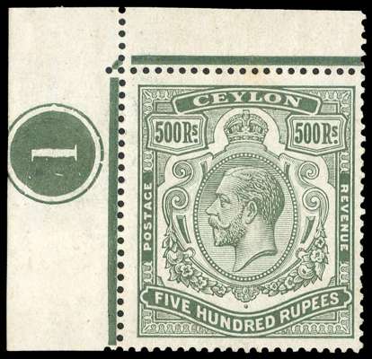 1912-25 Wmk MCA 500r dull green, upper left plate marginal, showing plate number ‘1’, brilliant o.g. gum a trifle toned and odd slightly shortish perfs, not detracting from otherwise very fine appearance for this rare high value. Desirable in this positional form. BPA Certificate (2009) SG 322 £8000