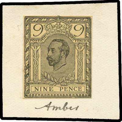 1911 9d Hentschel essay, printed in black on pale amber unwatermarked paper, affixed to piece of thin white card, endorsed ‘’Amber'' in manuscript at foot. Scarce.