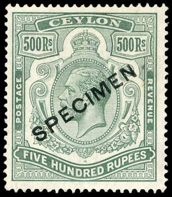 1912-25 Wmk MCA 500r dull green, optd local ‘SPECIMEN’ opt (Samuel type CE4) large part o.g. very fine and attractive, much scarcer than the usual UPU opt. SG 322s £800