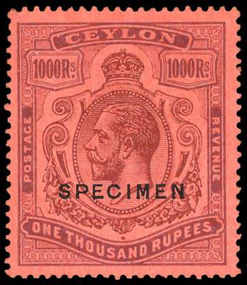 1912-25 Wmk MCA 1000r purple on red, optd ‘SPECIMEN’ small part o.g. still a desirable example of this splendid high value. SG 323s £2000