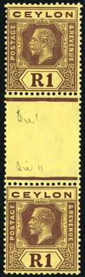 1921-32 Wmk Script 1r purple on pale yellow, Die I & Die II in interpanneau (gutter) vertical pair, from plates 7 & 12, unmounted o.g. fine. SG 354b £400