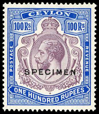 1921-32 Wmk Script, 100r dull purple & blue, optd ‘SPECIMEN’ large part o.g. fine with good colour. SG 360s £650