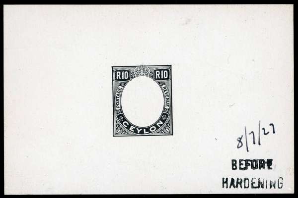 1927-29 frame for 10r value die proof in black on glazed card, (92x60mm) endorsed ‘BEFORE HARDENING’ and dated in m/s ‘8/7/27' very fine. SG 366var