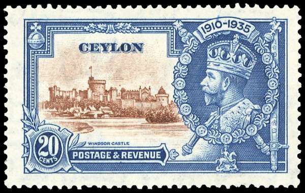 1935 Silver Jubilee 20c showing Plate 2B R8/3 ‘DOT TO LEFT OF CHAPEL’ large part o.g. fine. SG 381g £350