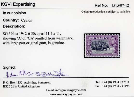 1938-49 50c black & mauve perf 11½x11, clearly showing variety ‘A’ of ‘CA’ missing from watermark, large part o.g. fine. KGVI Expertising Certificate SG 394da £1500