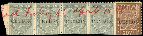 TELEGRAPHS: 1880 8a brown & 1r grey, used upper halves on telegraph piece, with virtually full ‘’Pearl Fishery 10th April 1881.'' m/s cancellation in the familiar red ink and hand used in Silavaturai, fold centrally between 2nd & 3rd 1r grey, and piece toned, still an attractive and scarce item. SG T3 & T4.