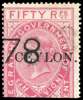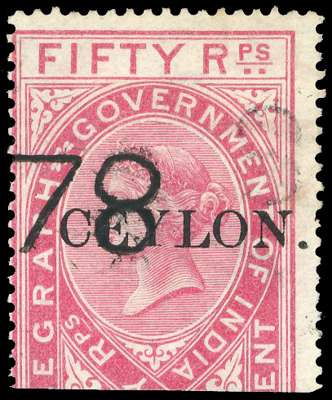 TELEGRAPHS: 1880 50r rose-carmine Die II, type T1 ‘’CEYLON.'' opt on India, upper half, used with ‘78’ cancel, very fine and rare. Only 100 issued, of which less than ten are known to have survived, including two in Tapling (one very defective) and one in the Royal Collection. SG T9 £800