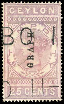 TELEGRAPHS: 1882 25c lilac ‘GRAPH’ opt on Stamp Duty Fiscal for provisional use, neatly cancelled by part strikes of Colombo d/s, minor marks and traces of rubbing/decolourisation, still a fine and desirable example of this famous rarity, only 540 issued. We have recorded less than a dozen examples, including those in the Tapling and Royal Collections. SG T22 £1000