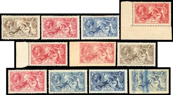 1913-34 selection of mint Seahorses arranged on stockcards, comprising 1913 Waterlow 2s6d rough plate proof on buff in indigo, 5s rough plate proof on buff in carmine and 10s indigo blue, 1915 DLR 2s6d, 5s, 10s, 1918-19 Bradbury Wilkinson 2s6d, 5s, 10s, 1934 re-engraved 5s bright rose-red (2). Generally good with fine appearance. (11)