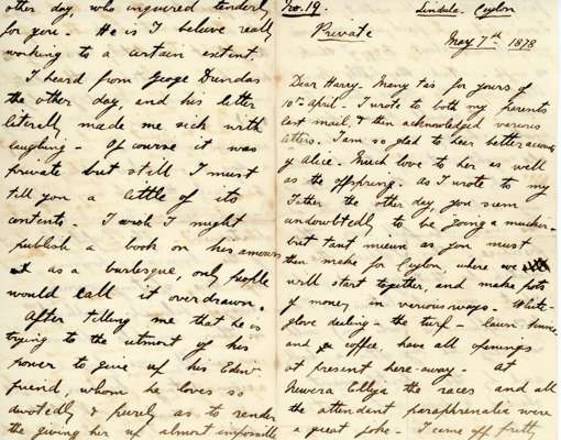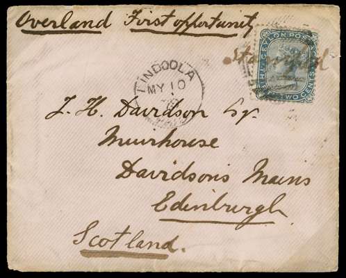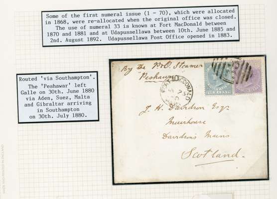 1877-80 pair of covers from the same correspondent addressed to Scotland, paying the reduced UPU rate of 32c when Ceylon joined on 1st April 1877. One envelope franked by 32c slate tied by duplex and Lindoola cds for MY 10 1878, endorsed ‘Overland First Opportunity’ backstamped by Galle d/s for MY 12 and transit and arrival marks, original contents included with the cover, discussing among other things the amorous desires of their cousin to his commanding officer's wife! Second cover franked by 4c grey and 16c pale violet, tied by ‘35' duplex and Fort Macdonald cds for Oc 25 80, endorsed ‘By the P.O. Steamer ’'Peshawar''', generally fine condition, an interesting pair.