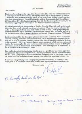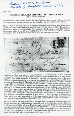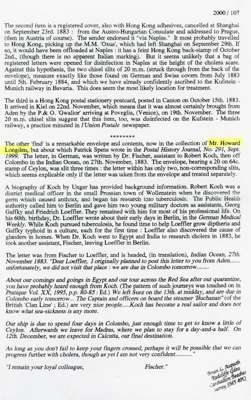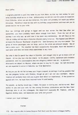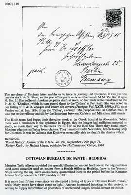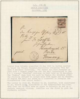 1883 disinfected mail addressed to Germany, franked by 20c on 64c red-brown, tied by Colombo duplex for NO 28, the cover was carried on the French M.M ‘Pei Ho’ (with French mark at foot for 3 Dec) having missed the P & O ‘Siam’, the vessel suffered a broken propeller at Aden and the mail was transferred to another P & O ship ‘Khedive’ and arrived in Port Said on 26 Dec, the mail was once again transferred to the ‘Cathay’ to Brindisi via Venice. This route was due to the Cholera outbreak in Egypt; the Italians would not accept mail which had come into contact with Egyptian soil. The envelope was disinfected in Bavaria with two slits, whereas the contents were seemingly given separate treatment and received three slits. Very rare, thought to be only recorded example of mail from Ceylon disinfected in Germany. The contents of the letter itself are of great historical and medical interest, being from Dr Fisher to his assistant Dr Loeffler, both of whom were bacteriologists who had worked with Dr Robert Koch, who discovered the germ that caused anthrax and would later go on to investigate the causes of Tuberculosis.