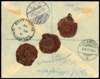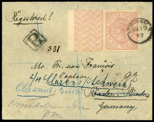 1899 registered envelope to Germany and re-addressed, franked by 1r.12 dull rose with full Congreve security selvedge at left, tied by Trincomalee cds for MR 13, with boxed ‘R’ h/s, backstamped by Colombo d/s Baden mark and Clarens arrival, a scarce and most interesting single franking. SG 201