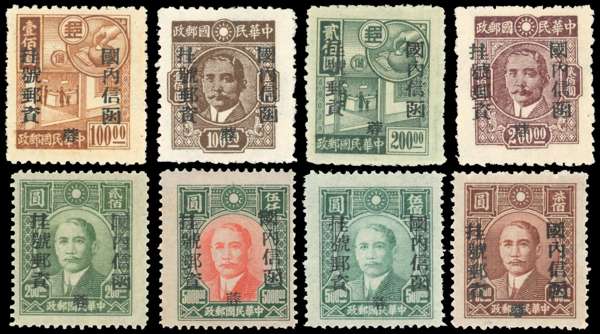 1949 (July) Szechwan Province 'registration' unit set of 8 to $5000 vermilion and green, fine unused as issued, a scarce set. SG 1270-77