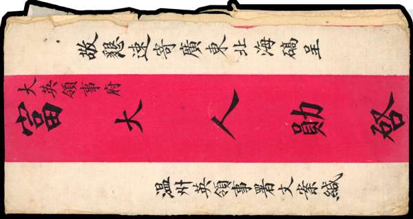1901 Red band cover franked with Coiling Dragon ½c brown, four singles and a pair, two tied by Wenchow (2.8) cds, the others cancelled on arrival in Wenchow, one adhesive cancelled with large Packhoi double-ring ds. One stamp removed and cover faults. Scarce