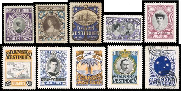 CINDERELLA: 1907-1916 Christmas seals, all unused o.g. less 1916 issue used bearing ship cancel marks, generally fair to fine condition, the 1907 seal particularly scarce. (10)