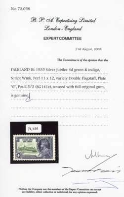 1935 Silver Jubilee 4d green and indigo from vignette plate ‘6’, variety ‘Double flagstaff’ (R5/2), fine unmounted o.g. BPA cert (2008). SG 141e, cat £1000+