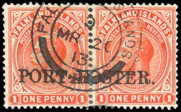 South Shetlands: 1912-31 KGV 1d optd ‘PORT FOSTER.’ used pair, bearing near complete Falkland Islands cds for MR 20 13, very fine and rare. RPSL Certificate (1944) SG Z107; Heijtz PF1a