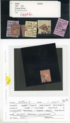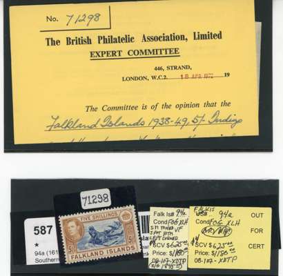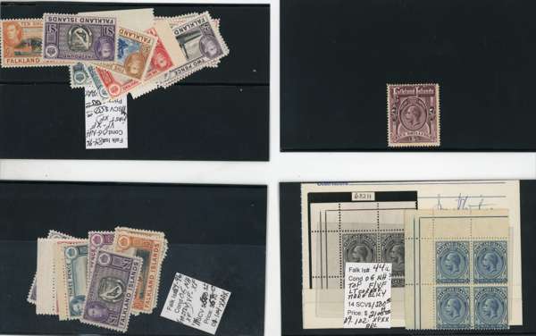 1878-1950 mixed mint and used selection arranged on stockcards, including 1878-79 1d claret (2, one defective unused), 1898 2s6d used (torn), 5s part og, 1904-09 1d dull coppery red (on thick paper), large part o.g., 2d reddish purple (BPA Certificate 2003), part o.g., 3s green, 5s red, 1912-20 £1 (2, one used), 1928 South Georgia provisional 2½D on 2d bearing forged surcharge, 1929-37 ‘Whale and Penguin’ values to £1, mint, and KGVI to £1 with 1938-50 5s indigo and yellow-brown, large part o.g, (BPA Certificate 1972). Condition very mixed with some fine. (73 items)