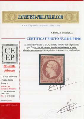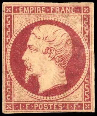 1853-61 Empire 1f carmine, four clear to good margins, unused with toned o.g. light stains, and vertical bend, otherwise fine, collectable example of this classic stamp. SG 72 Yvert 18 £10,000