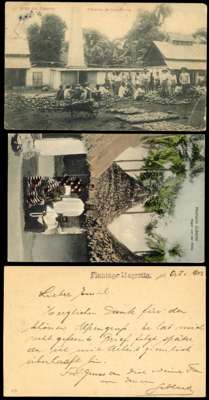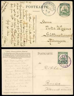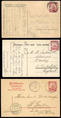 1902-13 selection comprising German East Africa 1902 registered cover to Germany, franked 5p (3) tied bu 'MIKINDANI/18 4 02' cds, 1906 7½h stationery postcard to Switzerland cancelled ‘MUHLOA/DEUTSCH/OST AFRIKA/11/10 06’ cds, 1910 registered cover to Germany franked 30h to pay registered rate tied ‘AMANI/22 6 10’ cds and Cameroon 1909-1913 quartet of picture postcards 1909 to England franked by 10pf tied by scarcer Jabassi Kamerun cds, 1912 to Thuringen franked by 5pf, 1913 to Buea franked by 5pf tied by Ekododo Gabon cds in violet. Mostly good to fine. (7)