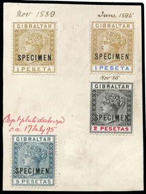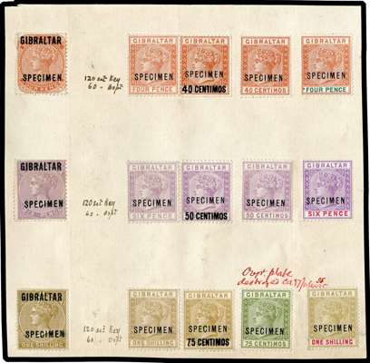 1886-98 complete representation of QV 'SPECIMEN' stamps, 39 items, comprising 1886, 1886-87, 1889 and 1898 sets of 7, and 1889-96 set of 11, being the De La Rue record pages (cut into three pieces) with invoice dates and plate details in M/S, with additional red M/S annotations 'Ovpt plate destroyed ca 17 July 95' in the case of the 1889-96 75c and 5p. The stamps are largely arranged in rows of 5, showing the succession of changes in each value by denomination. Some perf faults as a result of separation by scissors, but a unique and wonderful display which would make a magnificent frontispiece to any collection of the stamps of Gibraltar. Ex Kayfetz, described and fully illustrated in LP 1989, pp. 83-86. SG 1s-45s