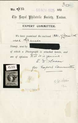 1875 surcharge ‘POSTAGE/ONE SHILLING' deep mauve showing ‘SHLLIING’ error, lightly used. RPS Certificate (1925). SG 13a