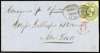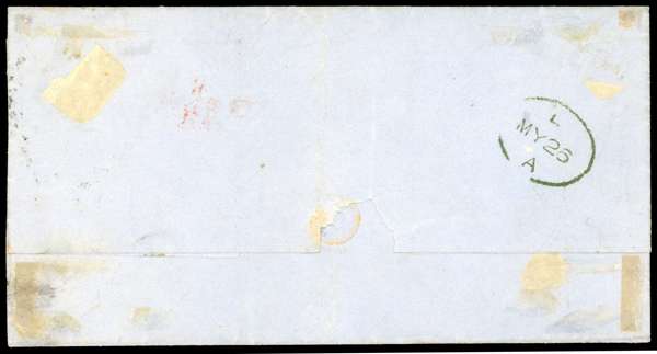 1855 entire to new York with 1s embossed (3 margins) tied by fine Liverpool spoon mark with “5 CENTS” to pay handstamp applied below in red. SG 56