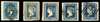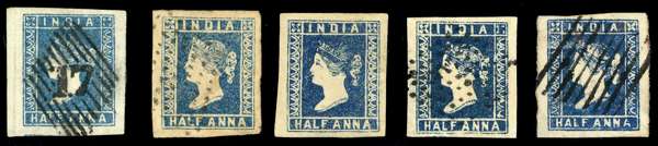 1854-55 ½a quintet; Die I ½a blue (towards pale) from scarcer Stone B with four large margins, cancelled by type 4 ‘17' mark for Surat, ½a pale blue, ½a deep blue and ½a indigo shades and Die II ½a blue Stone D, cancelled by rhomboid of bars, generally fair to fine condition. SG 2-6