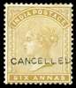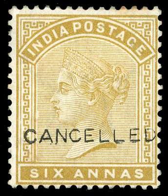 1882 6a yellow-bistre, the unissued value, perf 14 on wmk star paper, optd ‘CANCELLED’ Samuel type 9, part o.g. couple of toned perf tips at top, otherwise very rare, one of few recorded examples. SG 84-101var
