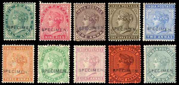 1882-90 ½a blue-green to 1r slate (less 4a) set of eight values each with local ‘SPECIMEN’ h/s (Samuel type 15) part o.g. (except 1a without gum). 2a with slight faults, and 12a (full o.g.) with short perfs, still a fine and scarce group, with fresh colour, mostly in shades or early printings. SG 84-101var