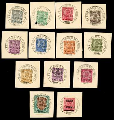 1911-23 3p to 1r and 1921 ‘NINE PIES’ surcharges, each tied to small piece by ‘HRH. THE PRINCE OF WALES’ CAMP P.O. pictorial cds for 17 MAR 22, a few minor blemishes, still a very fine and rare assembly, produced for the Royal Tour of India 1921-22. SG 151-86 & 192