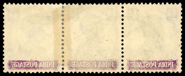 1940-43 KGVI ½a purple, used strip of three showing partial offset on reverse of lower country label, hinged on obverse and sensible perf reinforcement between 2nd & 3rd stamp, an interesting piece. SG 266var