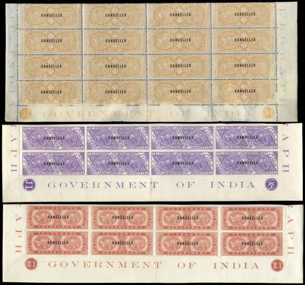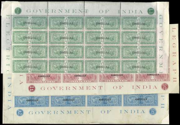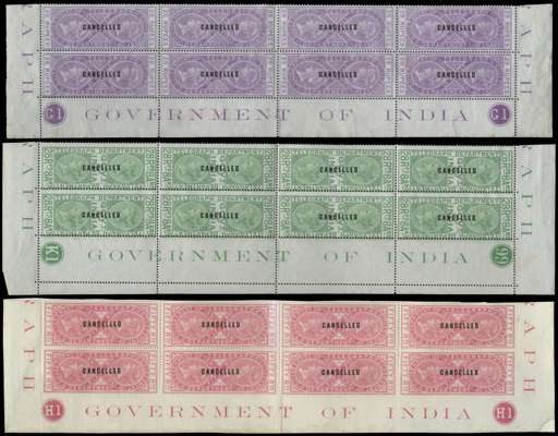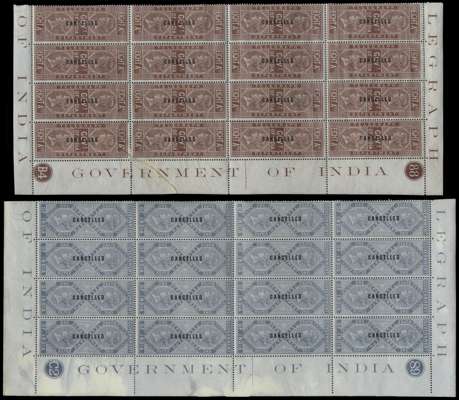 TELEGRAPHS: 1869-78 First wmk 1a to 8a, 1r Die II, 2r8a Die I, 5r, 14r4a, 25r Die I, 28r8a, 50r Die I, set of 11 values, with vertical 'CANCELLED' opt (Samuel type T8 - 1a, or T7), in MARGINAL BLOCKS OF SIXTEEN (1a to 2r8a) OR EIGHT (5r to 50r), each with full margins on three sides from the right or left (1a only) of sheets, showing either plate numbers x2 (2r8a, 5r, 25r, 50r - the original 1866 plates, before the introduction of current numbers for telegraph plates) or plate number and current number at opposite corners on the 1869 2a, 4a, 8a, 1r, 14r4a and 28r8a plates and the 1878 1a plate. The side margins all with full "GOVERNMENT OF INDIA" inscriptions (reading upwards), while both the top and bottom margins have partial "(TE)LEGRAPH" except for the 1a value (with "GOVERNMENT" at top, and "ELECTRIC" at bottom). A unique and wonderful assembly of the highest importance, each individual block being the largest now extant from the colour standard sheets of 80 (1a to 2r8a) or 40 (5r to 50r) retained in the De La Rue archives and placed on the market in the 1970s. The whole clearly documents the order of plate manufacture, and illustrates the changes in practice at De La Rue; these blocks each preserve 20% of the original sheets, and include HALF of all the plate and current numbers that were present, none of the balance now existing in comparable form. Some values (2a, 4a, 5r, 25r and 50r) remain partly affixed by the top and side margins to the archive ledger pages, but the others have been removed (causing some mostly minor faults to a small number of stamps in the 8a, 1r and 2r8a blocks). Overall very fine to superb condition, with lovely fresh colours and many of the total of 136 stamps unmounted, and truly a stunning array for exhibition.