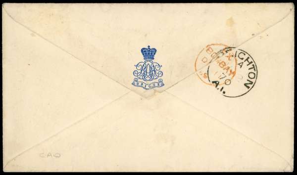 1869-70 Officer's letter from Kirkee to England franked by 6a8p slate, tied by type 9 duplex for DE 14 and pen stroke, correctly countersigned by commanding officer, backstamped by Bombay despatch for DE 17 and Brighton arrival for JA 2 1870, very fine and attractive single franking from this short-lived rate. SG 72