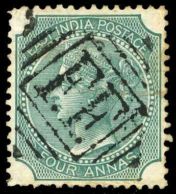 ABYSSINIA: 1866-67 India 4a green, struck by fine strike of ‘FF’ Field Force cancel, toned perf tips, otherwise fine, scarce. SG AZ6 £160