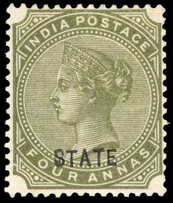 1891-96 4a olive-green, opt type 3, ERROR 'PATIALA' OMITTED, so that only ‘STATE’ appears, R.19/1, Dec 1898 printing, large part o.g. Only 81 possible, most of which were used and one of only a dozen or so unused examples known to us. Fine and scarce. SG 21a £800