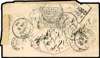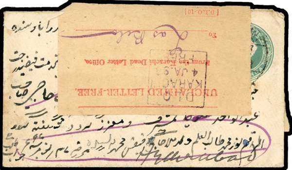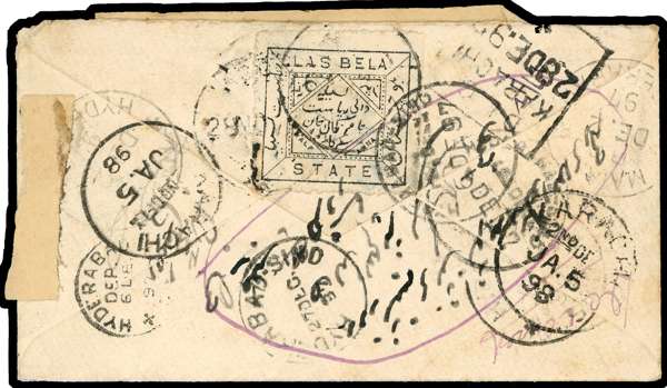 1898 India QV ½a postal stationery envelope, addressed to Hyderabad, franked on reverse by ½a black on white, tied by Karachi cds for 28 Nov. The addressee appeared to be elusive and the letter failed to be delivered, bearing transit cds for De 2, Hyderabad arrival for 6 Dec, unclaimed and returned with Hyderabad-Sind despatch cds for 27 Dec via Karachi Dead Letter Office with boxed h/s for 28 Dec, front bearing Karachi D.L.O printed label endorsed ‘Las Bela’ in m/s, and further boxed h/s for 4 Jan and arrival Karachi cds for 5 Jan, an attractive and most fascinating cover. SG 1