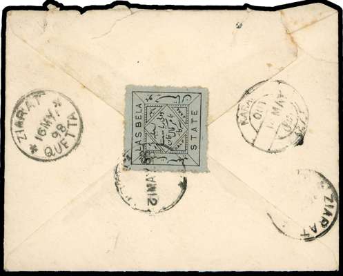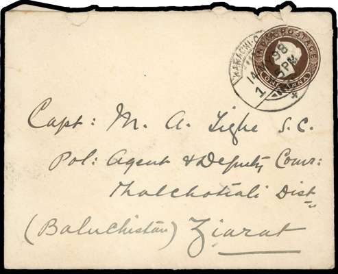 1898 India QV 1a postal stationery envelope addressed to Ziarat, franked on reverse by ½a black on greyish blue, tied by cds additionally showing inverted ‘2’ in 12 MAY, Karachi Camp cds on front for 14 MAY and Ziarat Quetta arrival marks for 16 MY, cover roughly opened, nevertheless an attractive and rare combination usage. SG 2