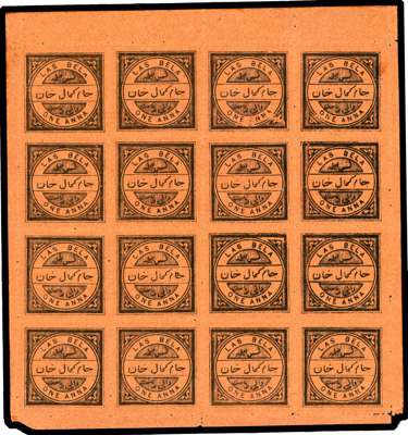 1901-02 1a black on orange complete sheet of sixteen (4x4), showing listed variety joined characters R3/3, unused with brilliant o.g. very minor perf separation at foot, an incredibly fine and rare item. SG 8/8a £1300+