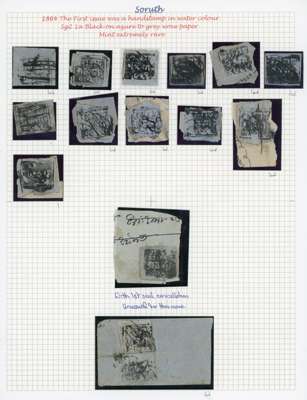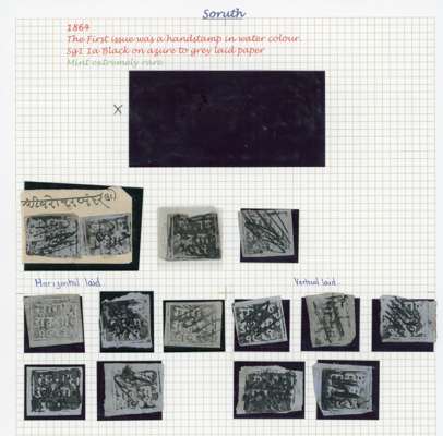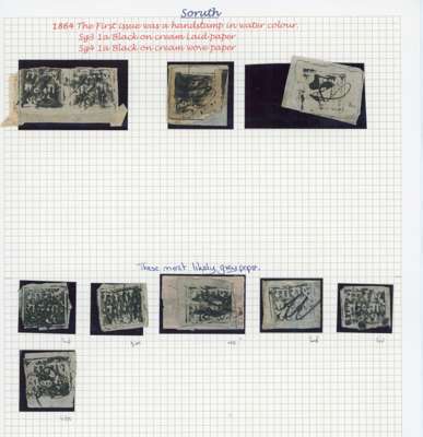 1864 (1a) black on azure to grey, laid and wove paper types, (mostly the former) collection on pages, used, including 1a laid type (2) on piece, 1a laid on piece with large margins, cancelled by unusual seal cancel, mostly cancelled by m/s, generally fair to fine condition. SG 1-2 (36)