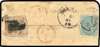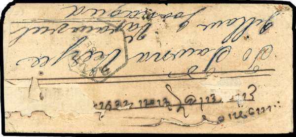 1869 native cover from Bombay to Junagadh, franked by typeset 1a black on pink wove paper, cancelled by thumb print, used in combination with India QV 1865 ½a pale blue, tied by Bombay duplex for 1 SP, with Junagadh arrival cdss for 4 SP, backstamped by transit mark, peripheral faults to cover, still very attractive and rare combination usage. SG 10