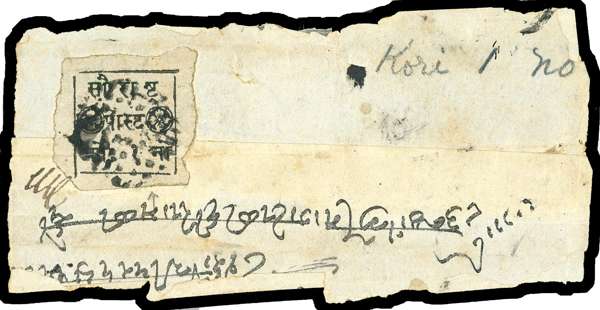 1868-75 typeset 1a black on azure laid paper, setting IVC, type 3 Gujarati numeral, close to large margins, showing variety LARGE NUMERAL (R.4/1) used on large native piece, cancelled by segmented cancel, horizontal crease, otherwise fine, scarce variety on cover. SG 12b