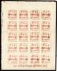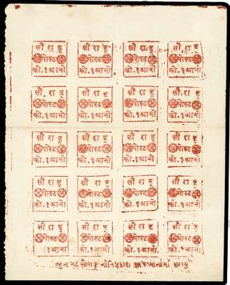 1868-75 typeset 1a red on white laid paper, setting IVE, type 3, Gujarati numeral, in complete sheet of twenty (4x5) pos. 17 (R.5/1) showing variety FIRST TWO CHARACTERS IN BOTTOM LINE OMITTED, horizontal crease between second and third row and couple of pinholes, still much fresher than usually seen, very scarce in this from. SG 13/13a £1320+