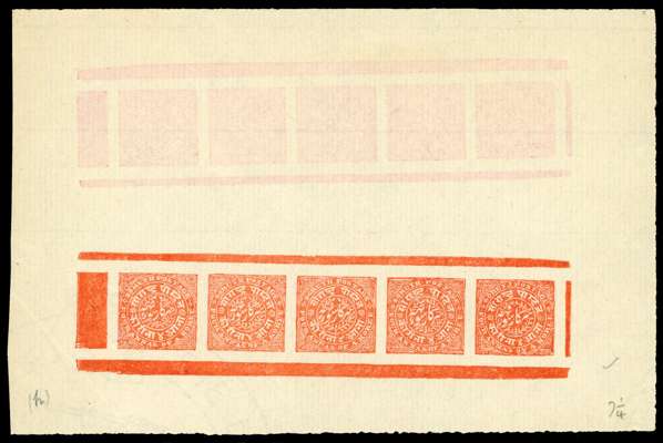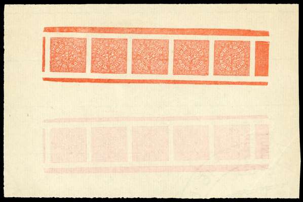 1878 4a vermilion, double tête-bêche sheet of 10 (two rows of five) printed on opposite sides on horizontally-laid paper, with trace of papermaker's watermark, imperforate, couple of minor creases, still very fine, a rarity and very striking. SG 17var