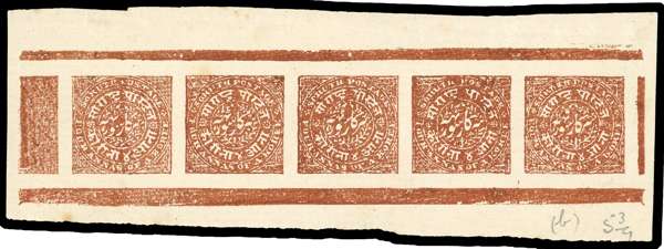1878-86 4a brown complete sheet of five on vertically-laid paper, fine unused, couple of minor light tones, still a rare sheet in this colour. SG 18