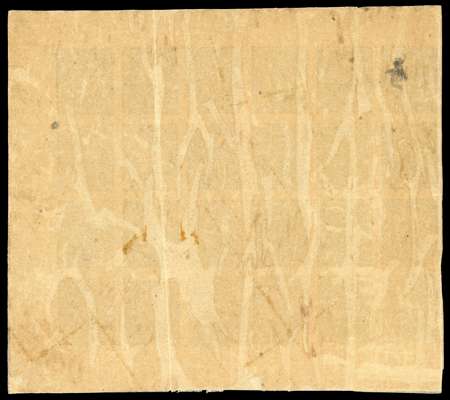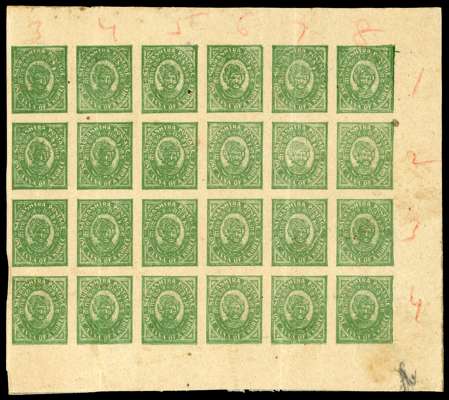 1903 1a essay in green on wove paper (gummed, with backing adhesion), the aborted issue with the Nawab's portrait, an imperforate block of twenty-four, (6x4, being the right six columns of a sheet with full margins on three sides). Printed from a plate of 32 (8x4), produced by Crowl & Co Baltimore, USA, between 1899-1903 and eventually delivered to Junagadh in late 1903. The Junagadh State Press would later produce proofs in red, green and mauve on laid and wove papers, based on the essay design. Some imperfections, creases, still an impressive and highly unusual multiple. Rare.